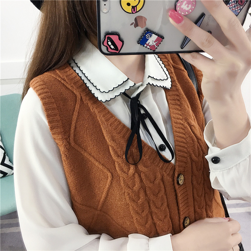 春装学院风宽松毛衣开衫女装无袖马甲针织衫纽扣短款百搭麻花外套