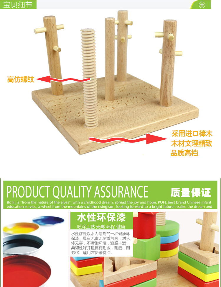木制多彩五柱积木套装 宝宝几何形状认知儿童配对玩具