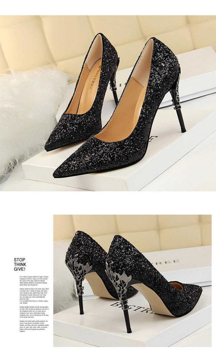 欧美时尚性感女鞋金属跟细跟高跟浅口尖头亮片单鞋