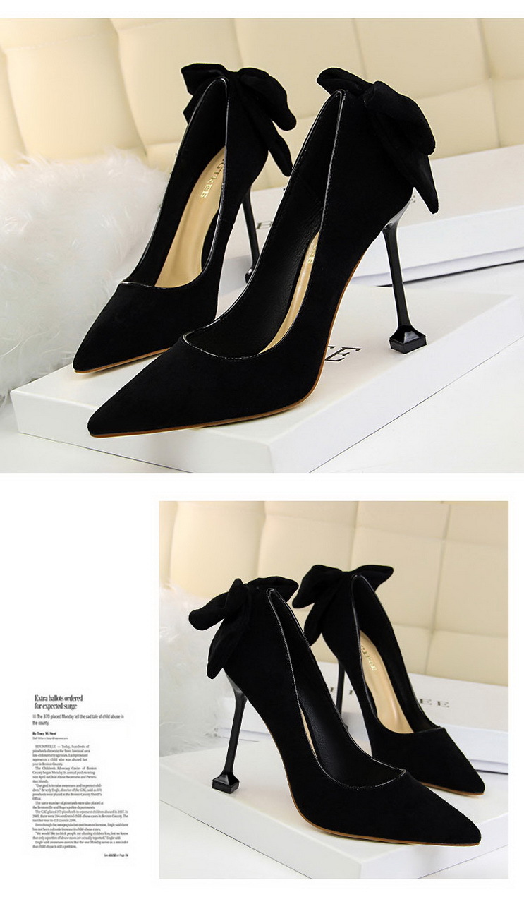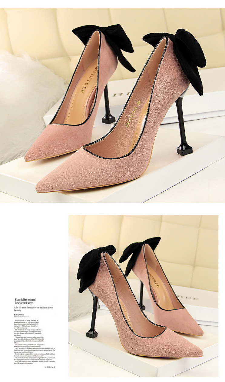 韩版性感显瘦高跟鞋女鞋细跟高跟绒面浅口尖头蝴蝶结单鞋
