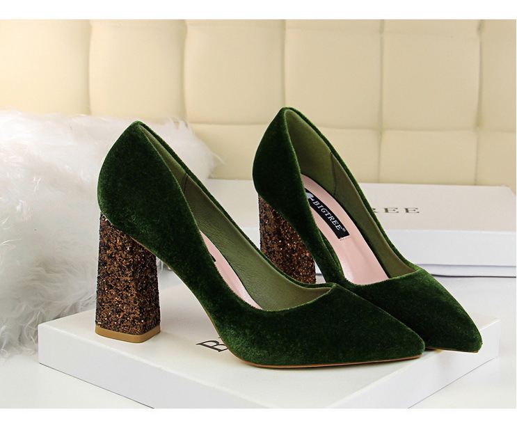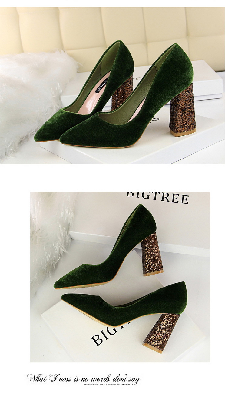 欧美风性感夜店高跟鞋女鞋亮片粗跟高跟绒面浅口尖头单鞋