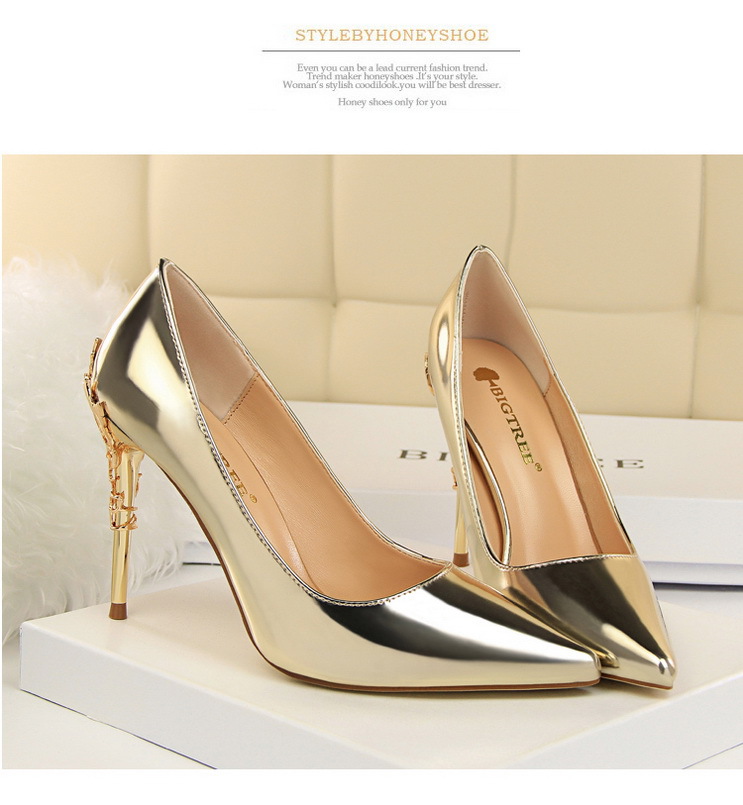 欧美风时尚性感金属跟女鞋细跟高跟浅口尖头漆皮显瘦单鞋