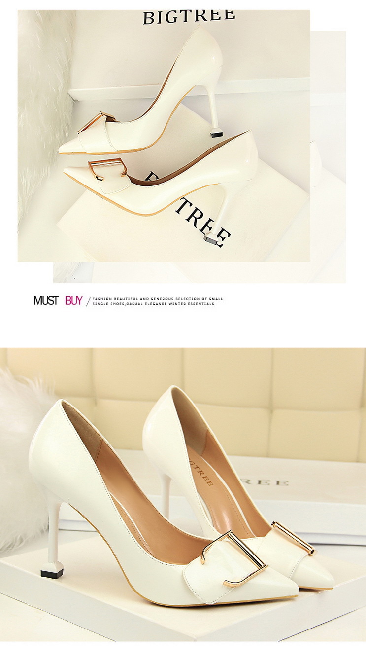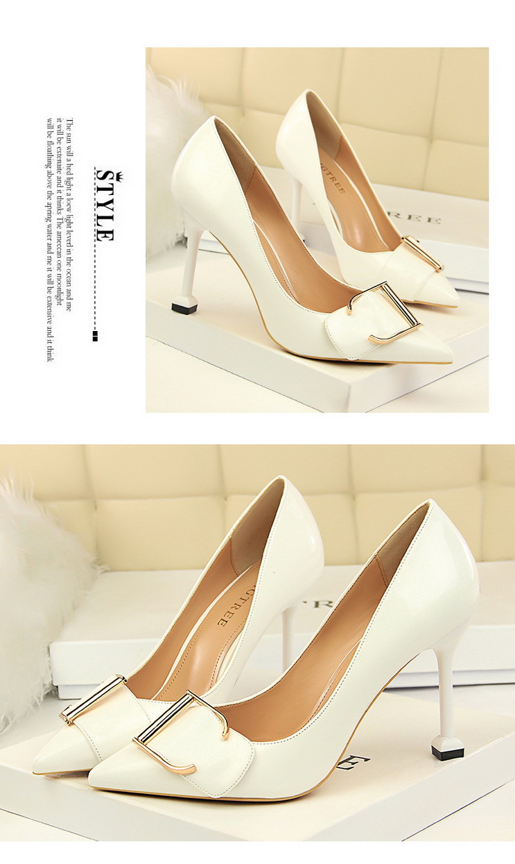 欧美风职业女鞋高跟鞋细跟高跟漆皮浅口尖头金属皮带扣单鞋
