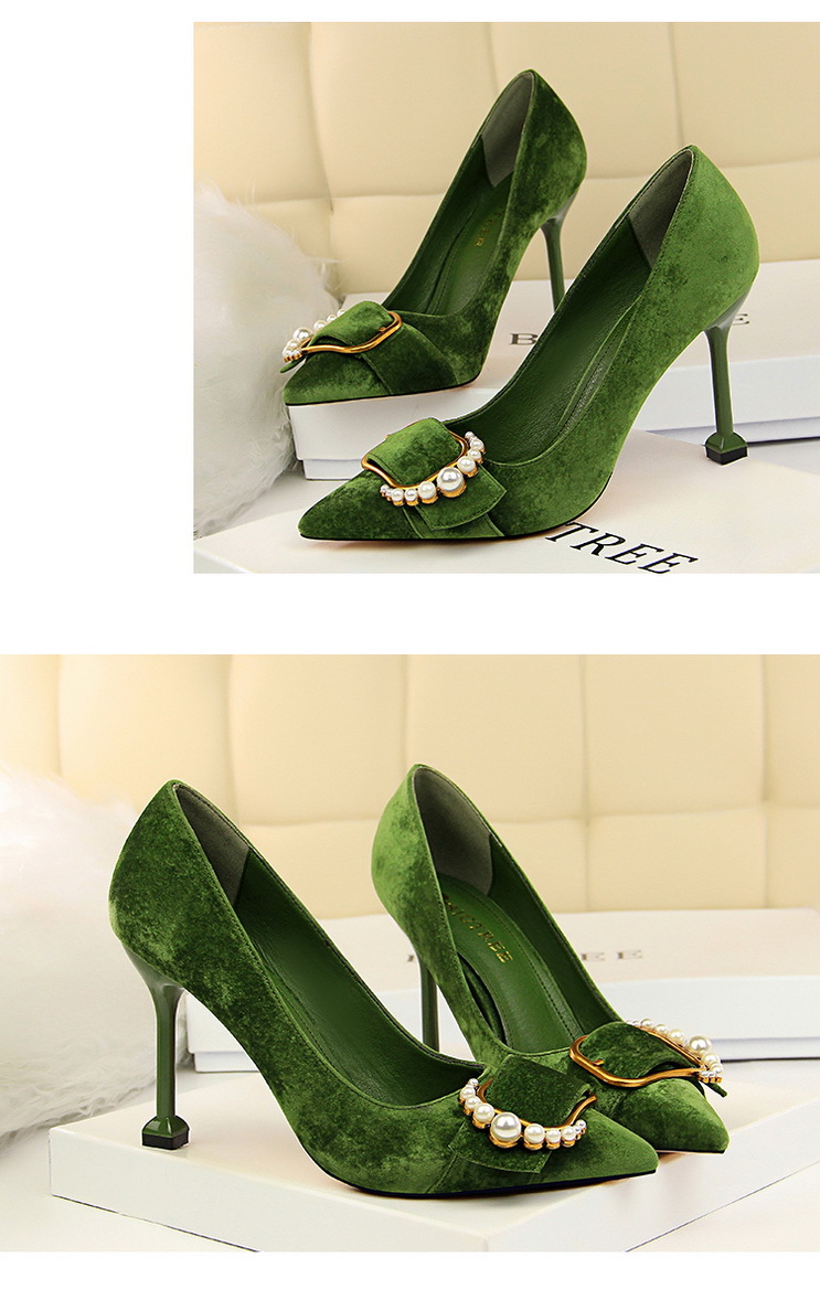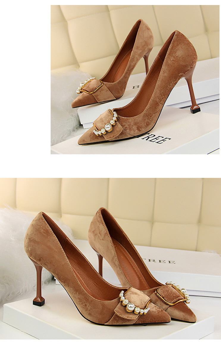 韩版时尚女鞋高跟绒面浅口尖头性感显瘦金属珍珠皮带扣单鞋