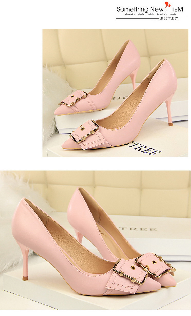 欧美时尚职业OL女鞋高跟鞋细跟浅口尖头金属皮带扣单鞋
