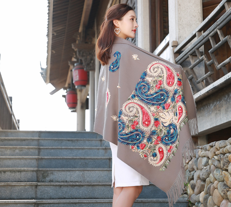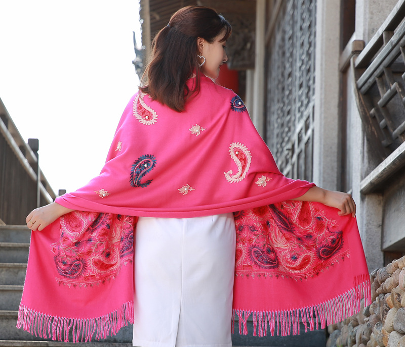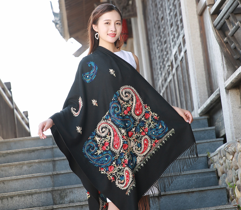 新疆民族风腰果绣花围巾女秋冬季旅游仿羊绒披肩流苏围脖长款