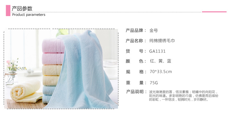 【金号】纯棉提缎毛巾70*33全棉素色面巾75g经济实用