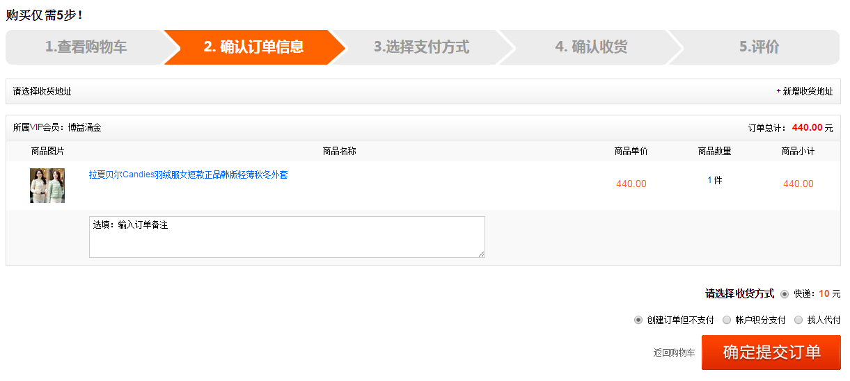 | 按照页面要求,填写收货人姓名、地址、联系方式等。 请您填写真实的收货人姓名、所在地区、详细的收货地址、邮编和联系电话。 |