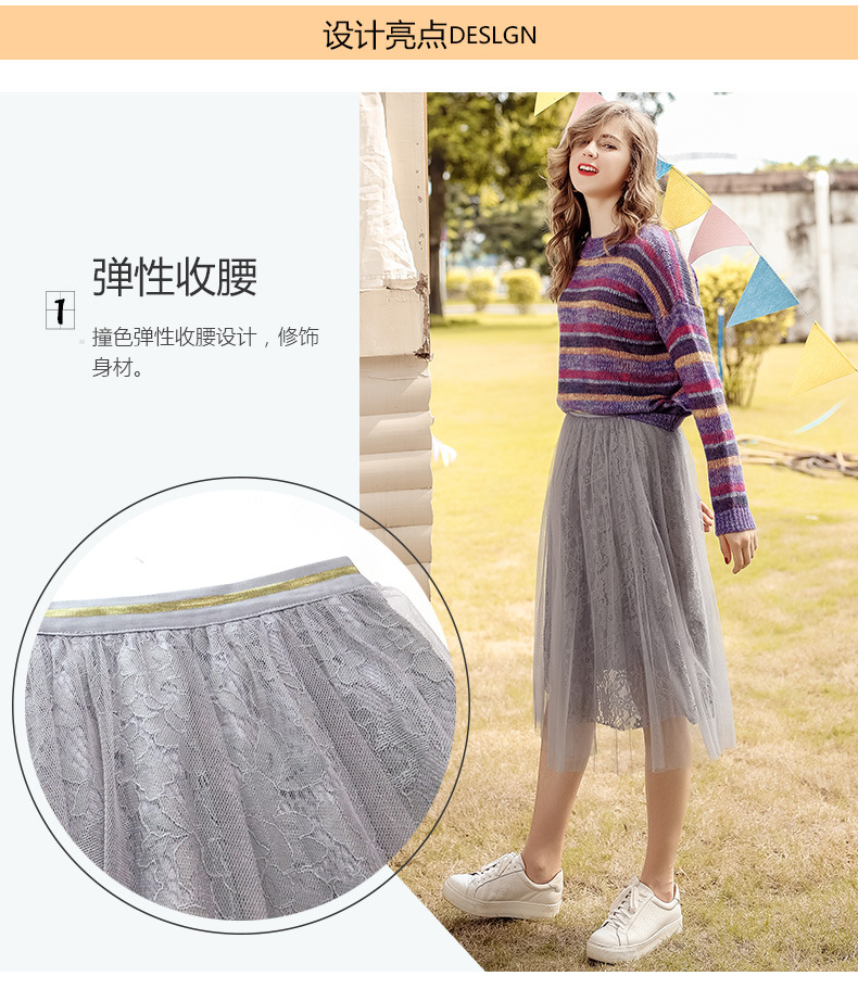 2018秋装新款韩版时尚中长款蕾丝百褶裙网纱半身裙