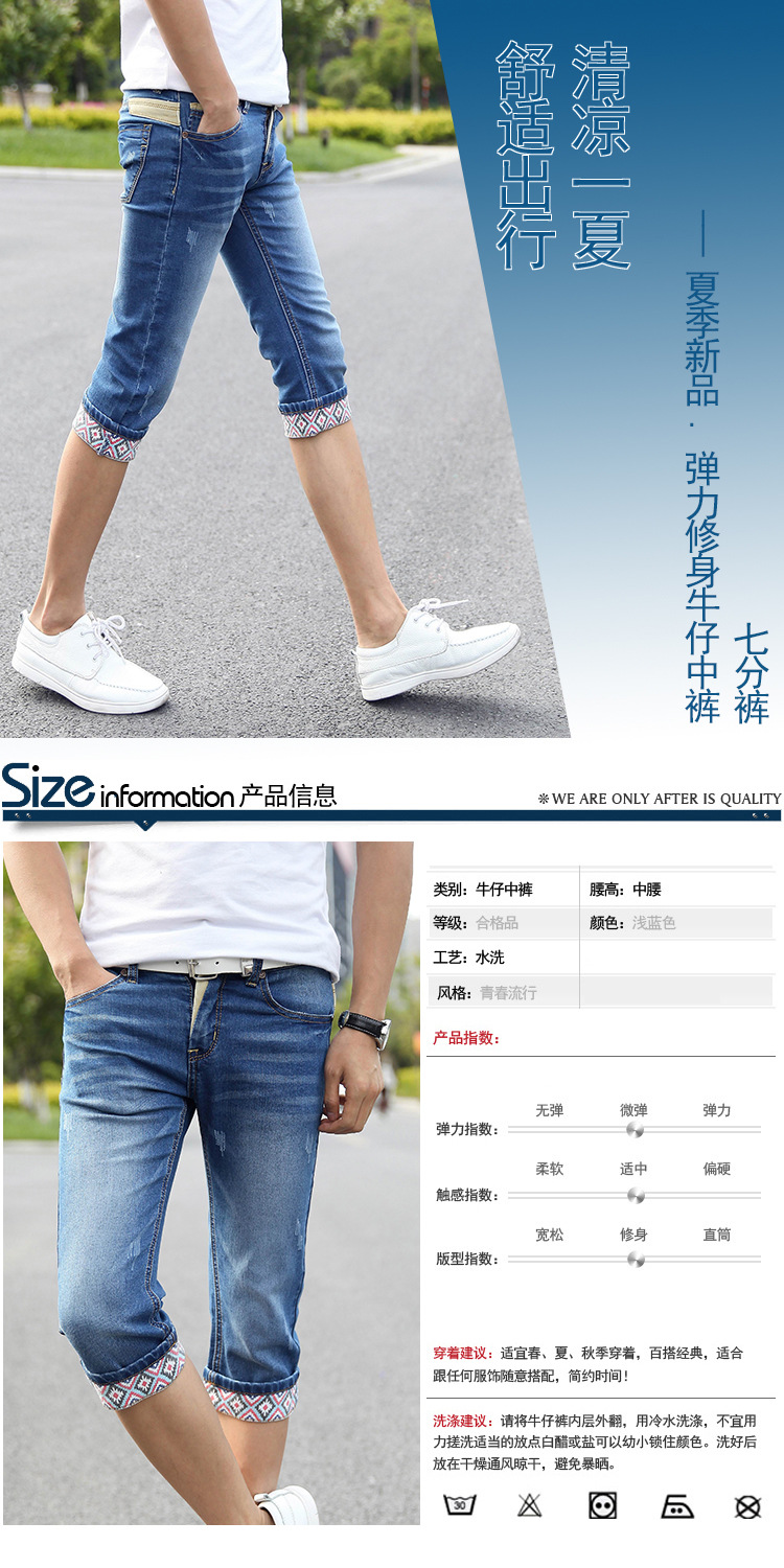 青年学生牛仔七分裤男夏季修身型小脚7分牛子裤潮流水洗花边裤子