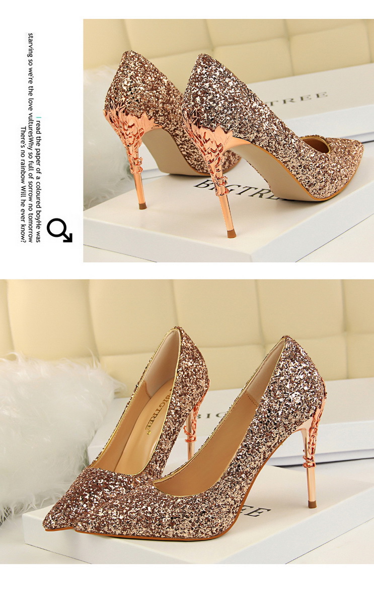 欧美时尚性感女鞋金属跟细跟高跟浅口尖头亮片单鞋