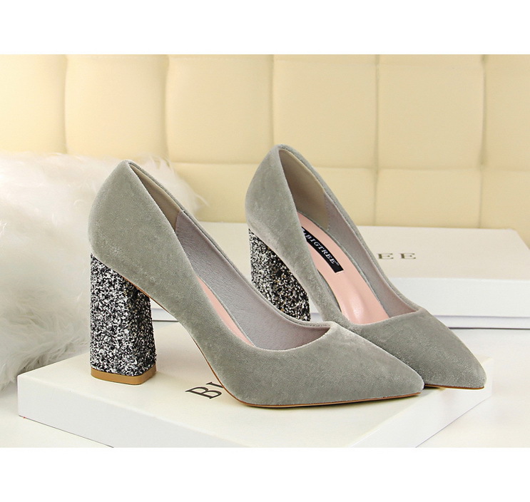 欧美风性感夜店高跟鞋女鞋亮片粗跟高跟绒面浅口尖头单鞋
