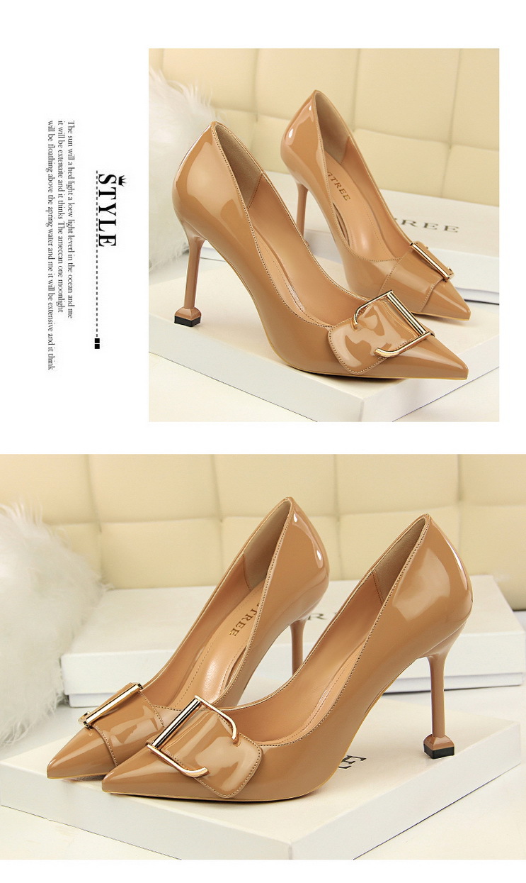 欧美风职业女鞋高跟鞋细跟高跟漆皮浅口尖头金属皮带扣单鞋