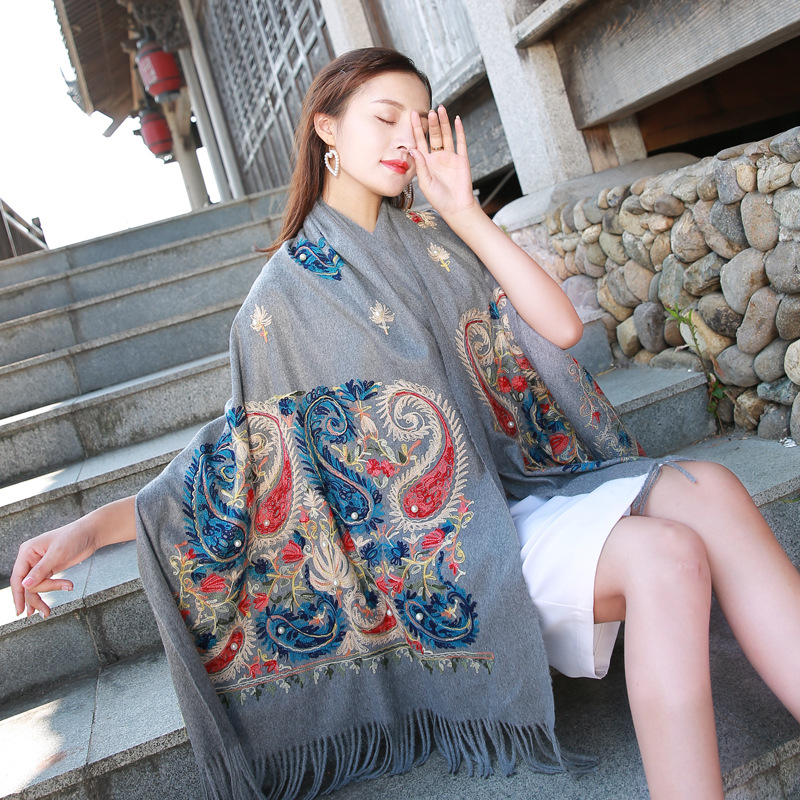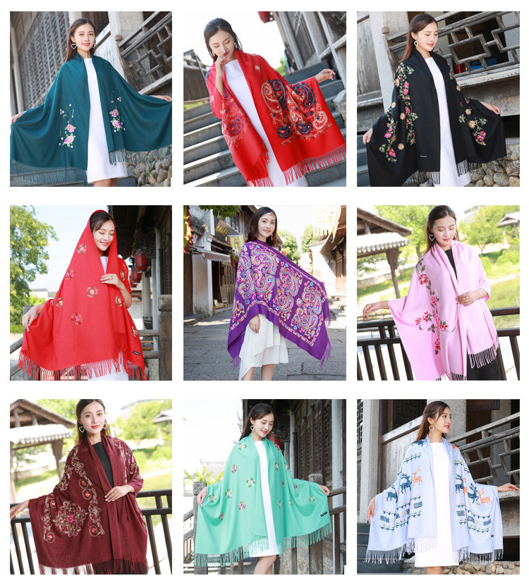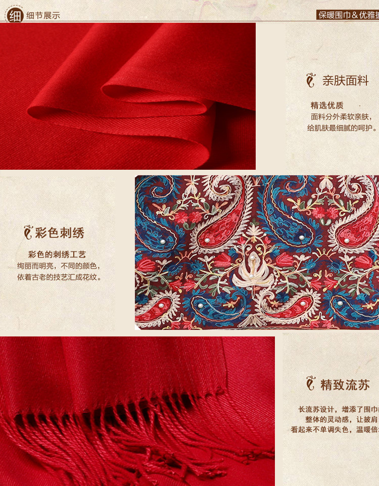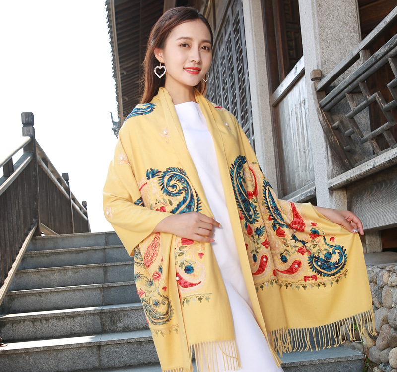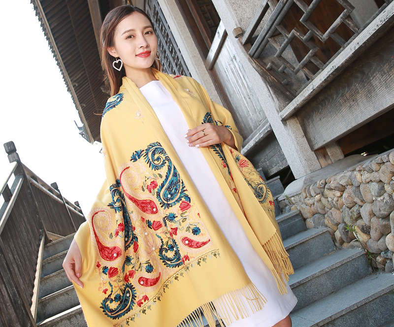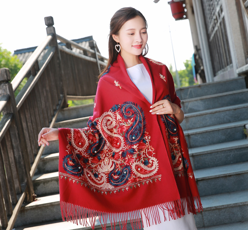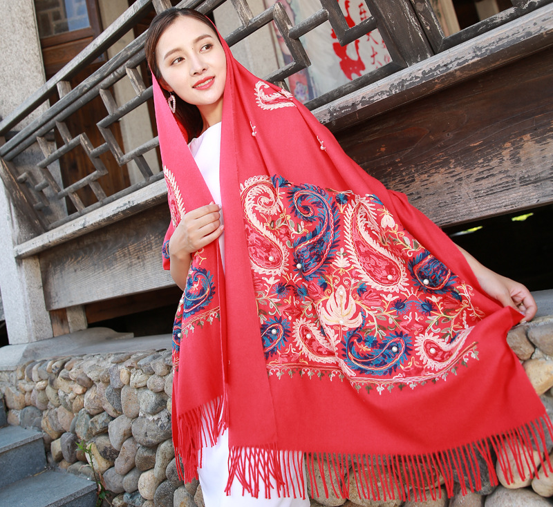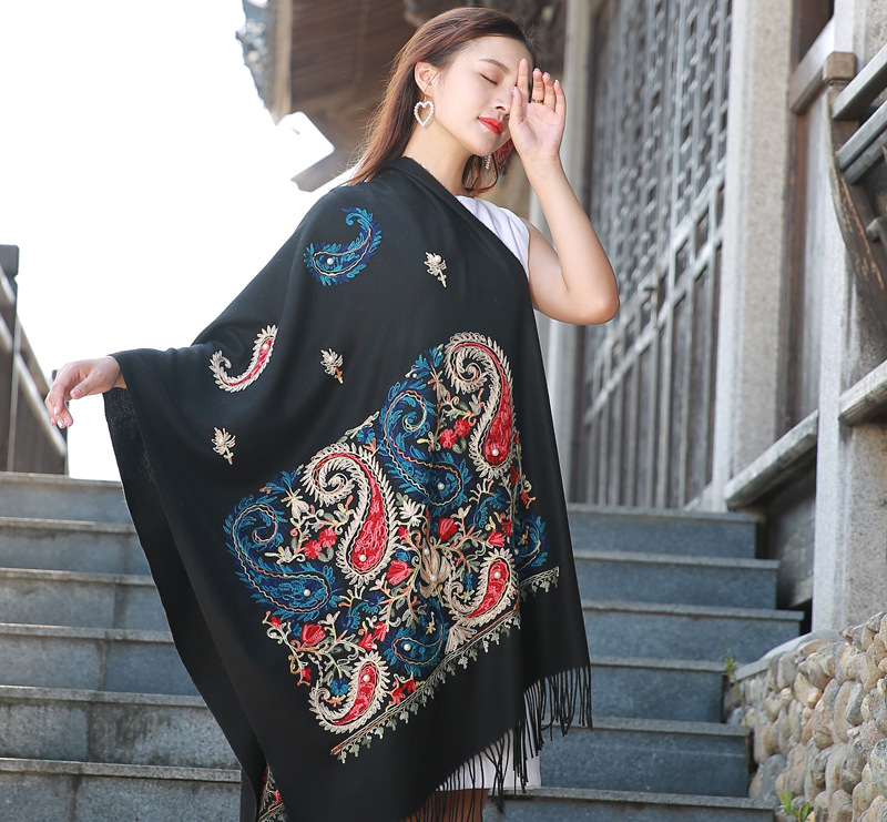 新疆民族风腰果绣花围巾女秋冬季旅游仿羊绒披肩流苏围脖长款