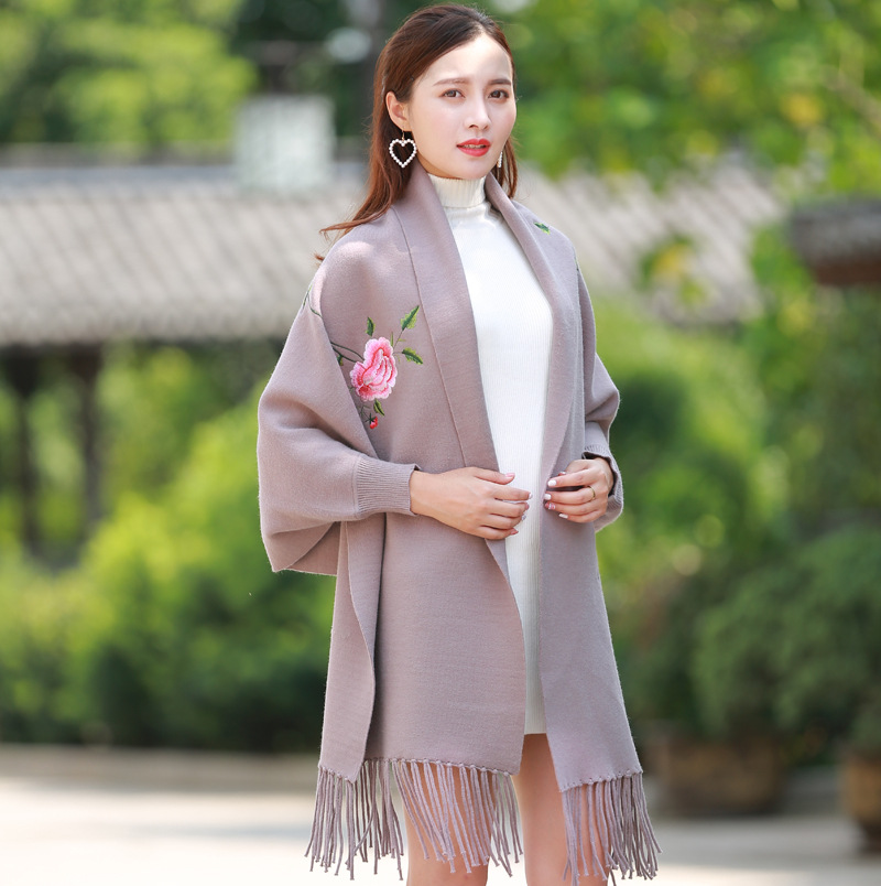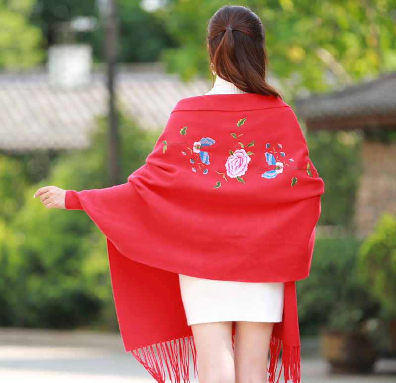 • 新款民族风刺绣空调披肩保暖围巾多功能百搭秋冬季绣花大披巾