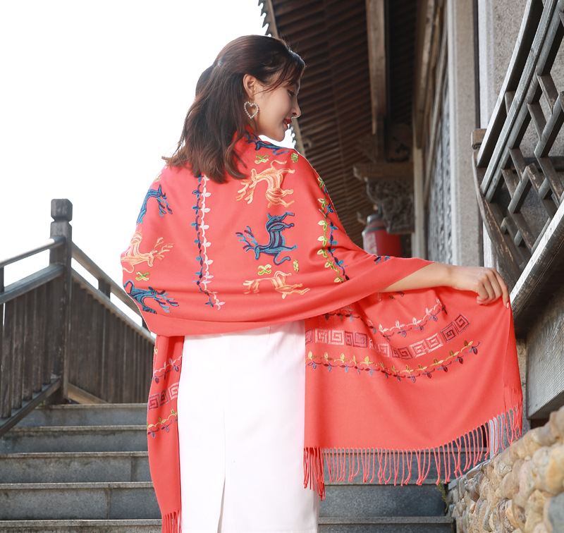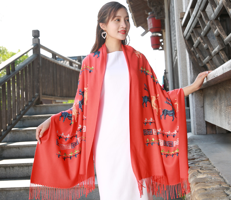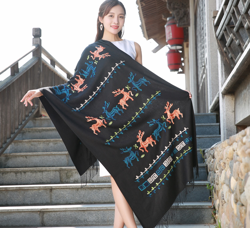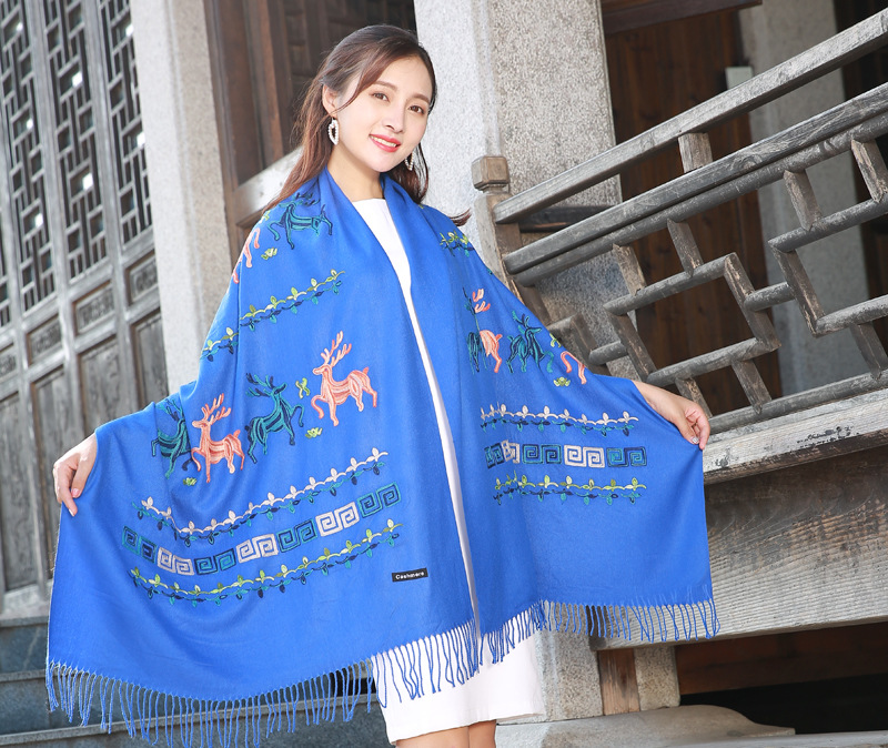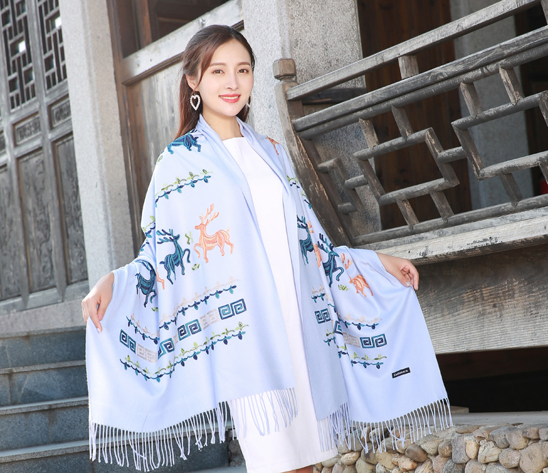 新款民族风小鹿秋冬绣花仿羊绒围巾女士保暖加厚披肩百搭两用